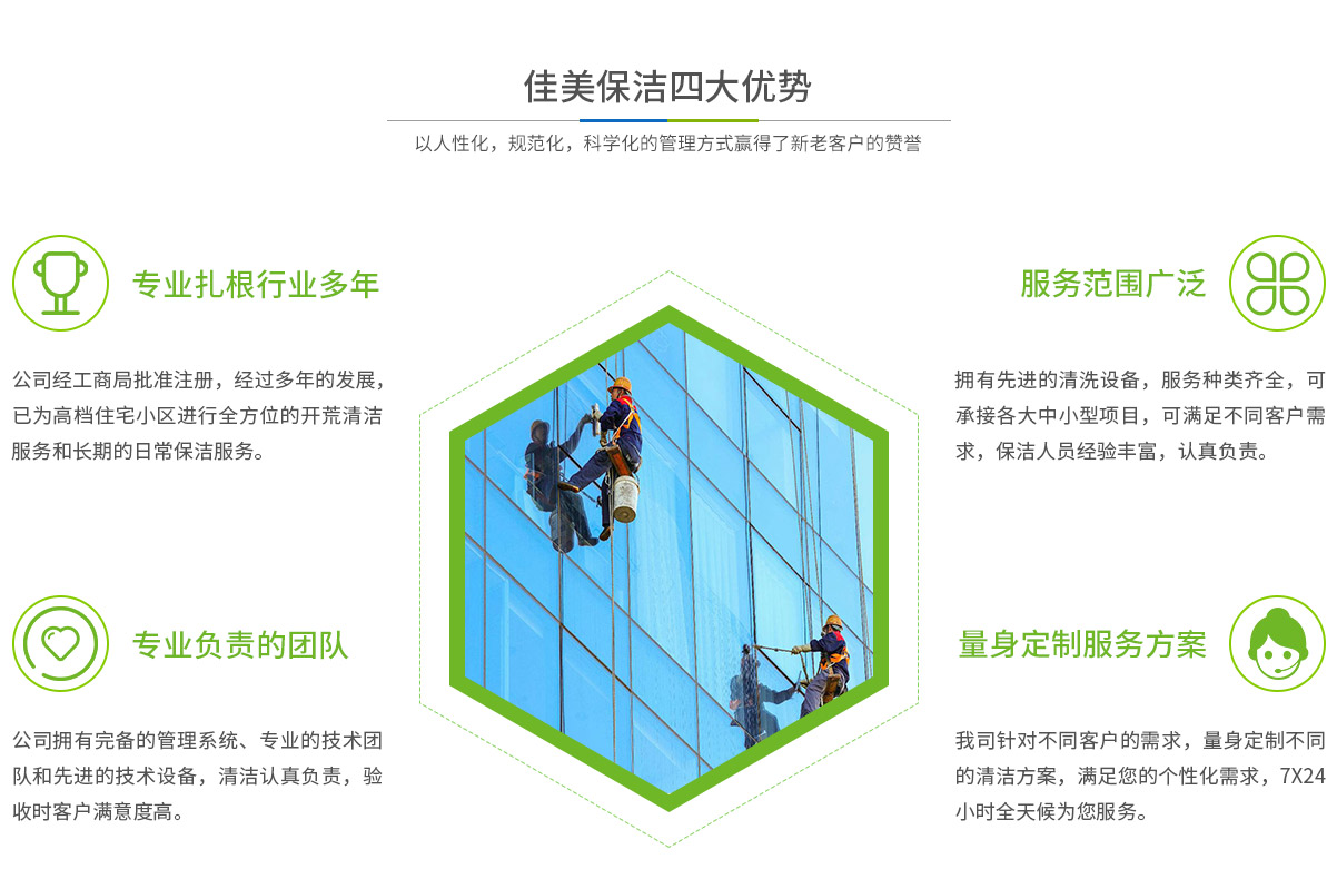 馬鞍山市佳美保潔服務(wù)有限公司是一家經(jīng)工商部門(mén)批準(zhǔn),具有法人資格專(zhuān)業(yè)清洗,馬鞍山保潔服務(wù)的公司,自創(chuàng)辦以來(lái),一直致力于企業(yè),家庭,賓館,學(xué)校,別墅,酒店,商廈,公共設(shè)施等場(chǎng)所提供科學(xué)的日常保潔和清潔保護(hù)的服務(wù)公司,有著豐富的管理服務(wù)和保潔經(jīng)驗(yàn)...